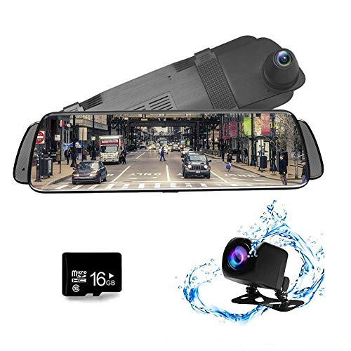 CUagain 10″ Touch Screen Mirror Dash Cam Backup Camera Kit for Streaming Media, Front and Rearview
