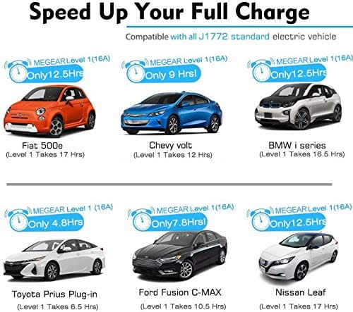 FASTER CHARGING SPEEDS: With level 1 charging, most electric vehicles will charge up to 8 miles per hour. Megear’s level 1 EVSE features 110V, 16 Amp charging and is up to 2x faster with a 110 volt outlet than your car’s original charger, which means you can spend more time heading out for fun and adventure and less time waiting around.
