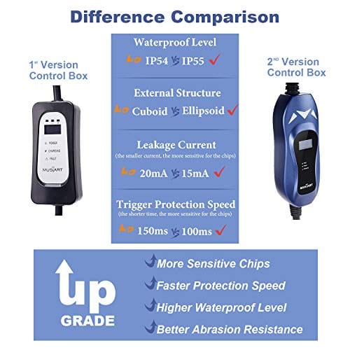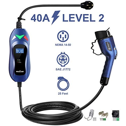 - FAST CHARGING SPEEDS WITH UPGRADE VERSION: The MUSTART upgraded 40A level 2 EV charger which is more sturdy, contains more sensitive chips, higher waterproof level and better abrasion resistance, can charge your car up to 2.5X faster than the 16A level 2 EV charger. It is 5X faster than the 16A level 1 EV charger that most electric vehicles come with. (The actual working current it uses depends on your vehicle settings).